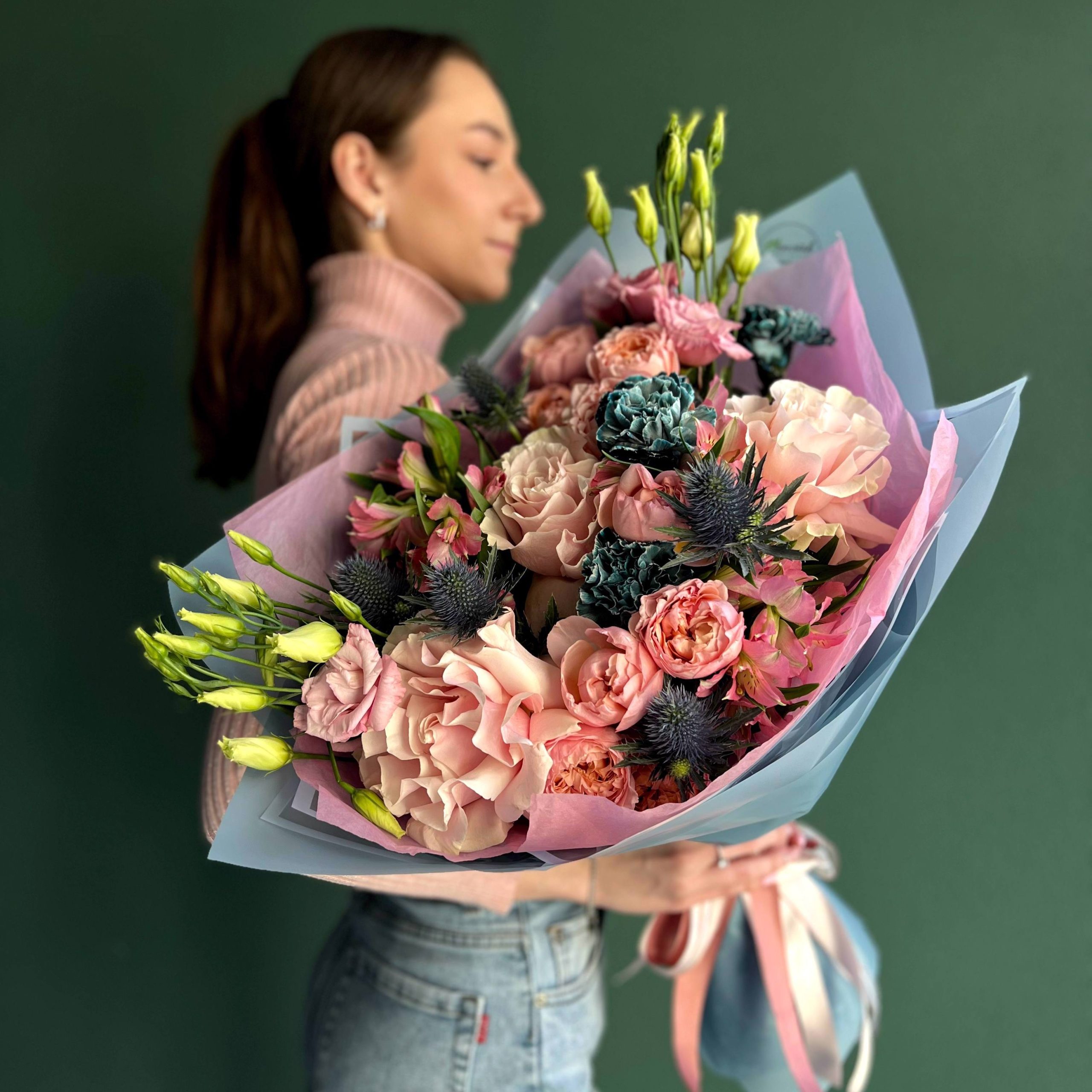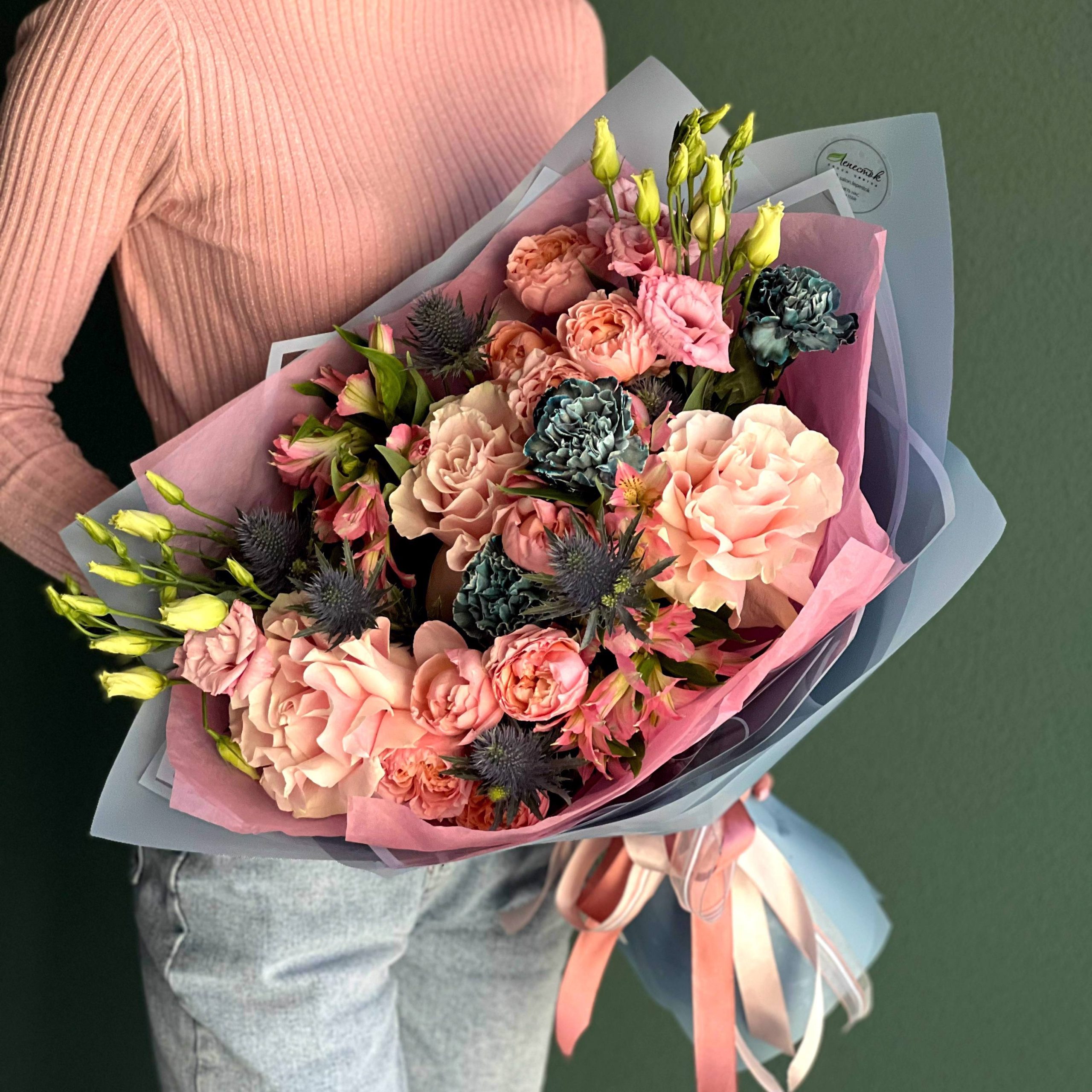 Роза по французски, Гвоздика Неви, Альстромерия розовая, Эрингиум, Кустовая пионовидная роза Джульета, Эустома Алиса Пинк, Стильная упаковка, Лента атласная
