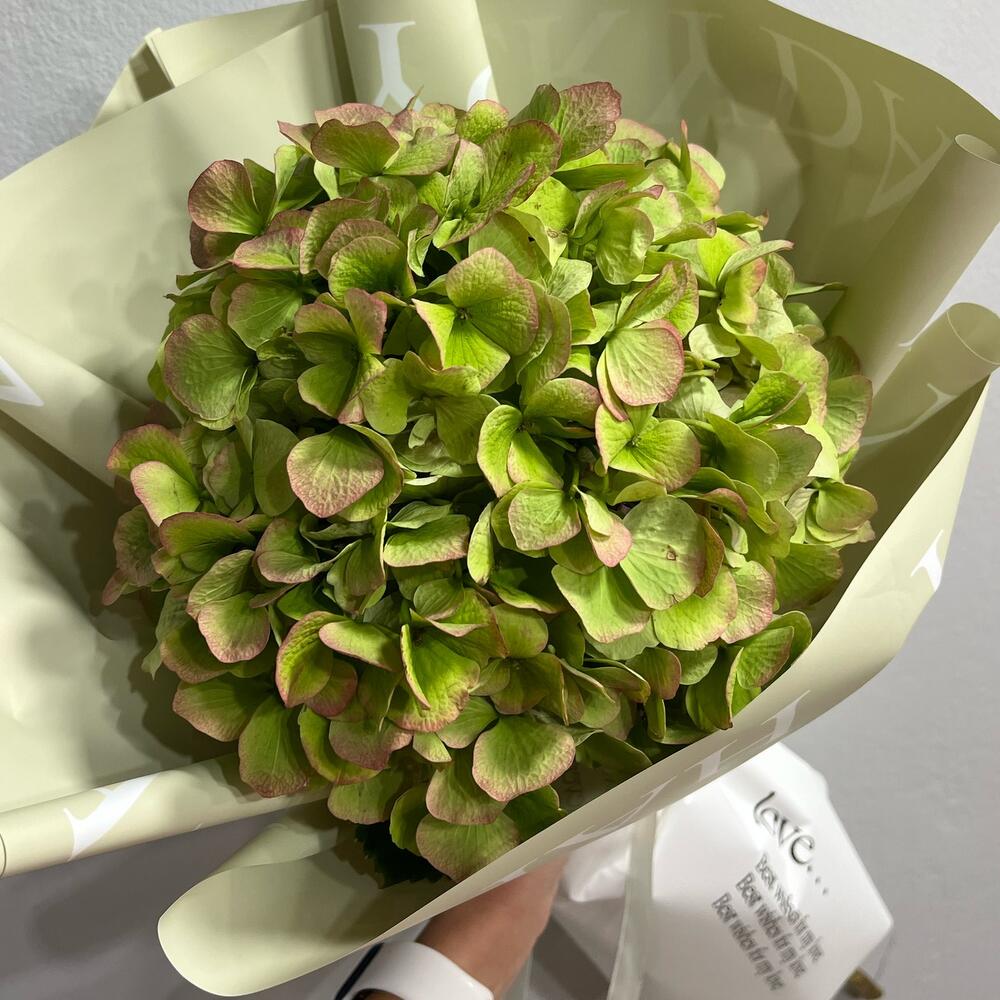 Красивая огромная гортензия в стильной упаковке с принтом «модного журнала» принесёт получателю радость и счастье.