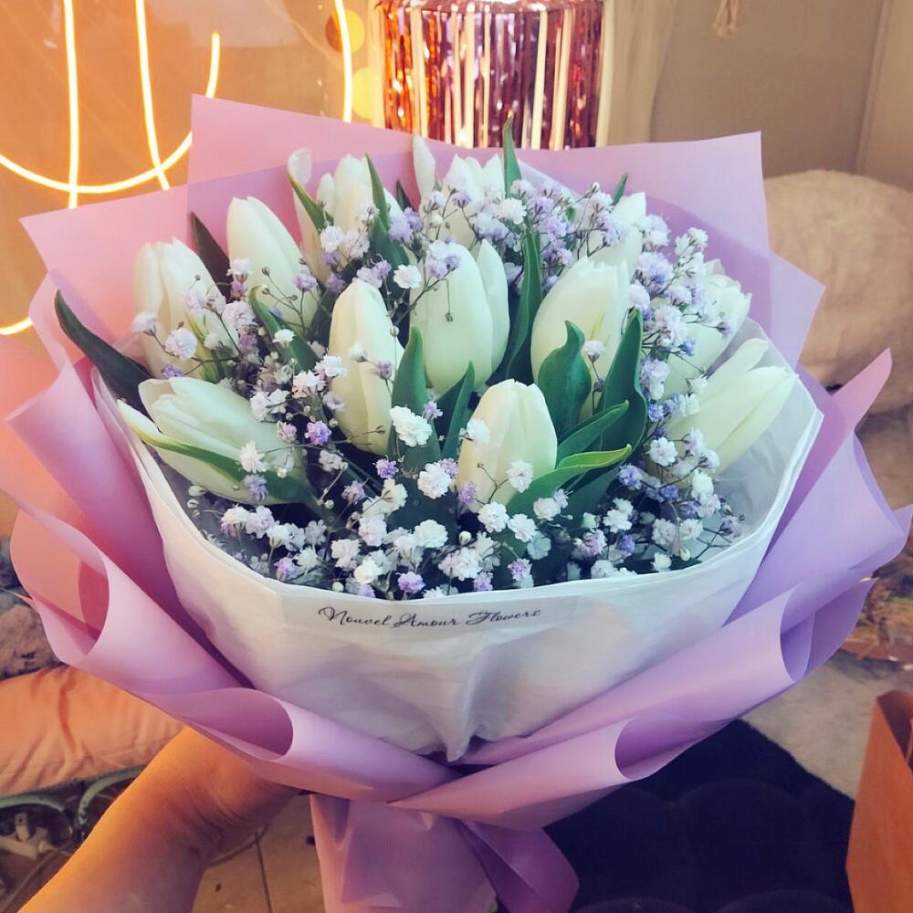 Тюльпан белый (голландия) - 13 шт. гіпсофіла кольорова - 3 шт. оформлення букета - 1 шт.